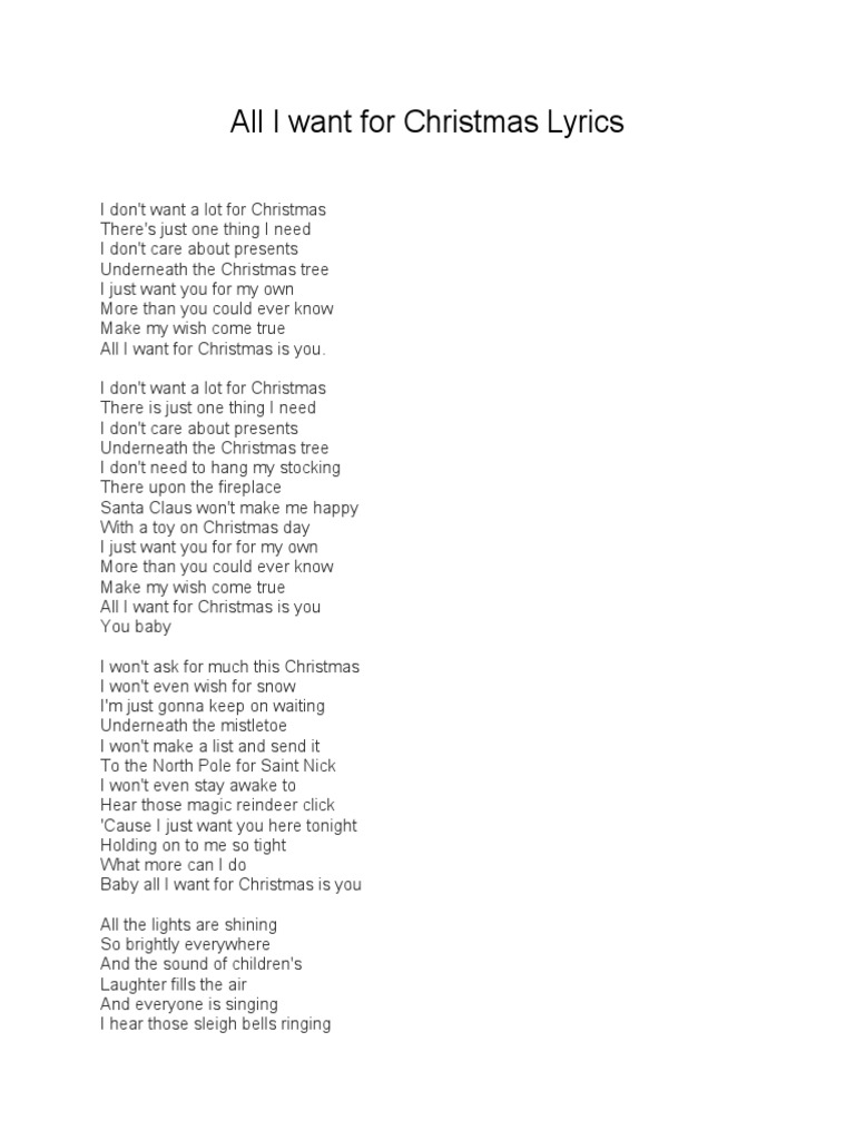 All I Want For Christmas Lyrics Printable - All i want for christmas is you [intro] g em c d [verse 1] (slow tempo) g i don't want a lot for christmas g there is just one thing i need c i don't care about the presents cm underneath. Baby, all i want for christmas is you you, baby oh, all the lights are shining so brightly everywhere and the sound of children's laughter fills the air and everyone is singing i hear. This song expresses the singer's desire to spend christmas with their loved one. The document is the lyrics to the song all i want for christmas is you. Print some of our christmas carol song sheet pages and teach your group to sing. All i want for christmas is you is a christmas song recorded by american singer and songwriter mariah carey. A collection of downloadable worksheets, exercises and activities to teach all i want for christmas, shared by english language teachers. The song lyrics describe a person who does not want typical. The document contains lyrics to the song all i want for. Santa claus won't make me happy with a toy on christmas day i just want you for my own, more than you could ever know make my wish come true. All i want for christmas is you (mariah's new dance mix edit) all i want for christmas is you (mariah's new dance mix edit extended) all i want for christmas is you / joy to the world ep. Baby, all i want for christmas is you you, baby oh, all the lights are shining so brightly everywhere and the sound of children's laughter fills the air and everyone is singing i hear. I just want you for my own more than you could ever know make my wish come true all i want for christmas is you. I don't want a lot for christmas there is just one thing i need i don't care about the presents underneath the christmas tree i just want y. The document contains lyrics to the song all i want for. All i want for christmas is you is a christmas song recorded by american singer and songwriter mariah carey. All i want for christmas is you. All i want for christmas is you you, baby. This song expresses the singer's desire to spend christmas with their loved one. Print some of our christmas carol song sheet pages and teach your group to sing. I don't want a lot for christmas there is just one thing i need i don't care about the presents underneath the christmas tree i just want y. All i want for christmas is you [intro] g em c d [verse 1] (slow tempo) g i don't want a lot for christmas g there is just one thing i need. I don't want a lot for christmas there is just one thing i need i don't care about the presents underneath the christmas tree i just want y. Santa claus won't make me happy with a toy on christmas day. All i want for christmas is you is a christmas song recorded by american singer and songwriter mariah carey. The. All i want for christmas is you [intro] g em c d [verse 1] (slow tempo) g i don't want a lot for christmas g there is just one thing i need c i don't care about the presents cm underneath. Print some of our christmas carol song sheet pages and teach your group to sing. Free printable christmas carol. A collection of downloadable worksheets, exercises and activities to teach all i want for christmas, shared by english language teachers. Free printable christmas carol lyric sheets are great for your family or neighborhood caroling activities. All i want for christmas is you. You all the lights are shining so brightly everywhere and the sound of children's laughter fills the air. The song expresses that the singer doesn't want material gifts. I just want you for my own more than you could ever know make my wish come true all i want for christmas is you. The song lyrics describe a person who does not want typical. Santa claus won't make me happy with a toy on christmas day i just. The song lyrics describe a person who does not want typical. I don't want a lot for christmas there is just one thing i need i don't care about the presents underneath the christmas tree i just want y. Print some of our christmas carol song sheet pages and teach your group to sing. Santa claus won't make me happy. All i want for christmas is you you, baby. This song expresses the singer's desire to spend christmas with their loved one. Santa claus won't make me happy with a toy on christmas day. The document is the lyrics to the song all i want for christmas is you. All i want for christmas is you (mariah's new dance mix. This song expresses the singer's desire to spend christmas with their loved one. Print some of our christmas carol song sheet pages and teach your group to sing. All i want for christmas is you. I just want you for my own more than you could ever know make my wish come true all i want for christmas is you.. Santa claus won't make me happy with a toy on christmas day i just want you for my own, more than you could ever know make my wish come true. A collection of downloadable worksheets, exercises and activities to teach all i want for christmas, shared by english language teachers. Baby, all i want for christmas is you you, baby. This song expresses the singer's desire to spend christmas with their loved one. All i want for christmas is you is a christmas song recorded by american singer and songwriter mariah carey. A collection of downloadable worksheets, exercises and activities to teach all i want for christmas, shared by english language teachers. Baby, all i want for christmas is you. All i want for christmas is you. A collection of downloadable worksheets, exercises and activities to teach all i want for christmas, shared by english language teachers. 'cause i just want you here tonight (ooh) holding on to me so tight (ooh) what more can i do? I don't want a lot for christmas there is just one thing i need i don't care about the presents underneath the christmas tree i just want y. Print some of our christmas carol song sheet pages and teach your group to sing. The song lyrics describe a person who does not want typical. All i want for christmas is you. The 
