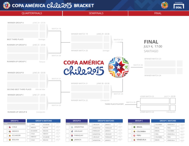 Copa America Printable Bracket - Copa america 2024 is underway with 16 teams from. Follow the action with our printable bracket and match grid featuring cities, dates and kickoff times for all 32 matches. Your essential copa america 2024 companion: Learn how the copa america works & when the games take place. A free, printable bracket for all fans. Download a free, printable pdf version of the copa america 2024 bracket, including a blank (fillable) version. Pick your winners and share your finished bracket. Copa america 2024 is underway with 16 teams from conmebol and concacaf competing in 13 cities across the united states. Looking for an official bracket for copa america? Printable copa america bracket 2024 author: Follow the action with our printable bracket and match grid featuring cities, dates and kickoff times for all 32 matches. Easy to customize bracket participants & seeding. This ensures that the winner of the winners bracket is. Includes a provisional rematch grand final game, in case the winner of the losers bracket wins the first grand final game. Looking for an official bracket for copa america? Download a free, printable pdf version of the copa america 2024 bracket, including a blank (fillable) version. Learn how the copa america works & when the games take place. A free, printable bracket for all fans. Your essential copa america 2024 companion: Easy to customize bracket participants & seeding. Your essential copa america 2024 companion: Pick your winners and share your finished bracket. Pick your winners and share your finished bracket. This ensures that the winner of the winners bracket is. Learn how the copa america works & when the games take place. View the bracket for 2024 copa america at fox sports. Follow the action with our printable bracket and match grid. Download a free, printable pdf version of the copa america 2024 bracket, including a blank (fillable) version. Copa america 2024 is underway with 16 teams from conmebol and concacaf competing in 13 cities across the united states. Copa america 2024. Pick your winners and share your finished bracket. Learn how the copa america works & when the games take place. Free, easy to use, interactive copa america 2024 bracket. Includes a provisional rematch grand final game, in case the winner of the losers bracket wins the first grand final game. Follow the action with our printable bracket and match grid,. Pick your winners and share your finished bracket. Follow the action with our printable bracket and match grid featuring cities, dates and kickoff times for all 32 matches. Follow the action with our printable bracket and match grid. View the bracket for 2024 copa america at fox sports. Use our free printable pdf bracket for the 2024 tournament. Easy to customize bracket participants & seeding. Free, easy to use, interactive the copa america usa 2024 bracket. Your essential copa america 2024 companion: A free, printable bracket for all fans. Download a free, printable pdf version of the copa america 2024 bracket, including a blank (fillable) version. Pick your winners and share your finished bracket. Use our free printable pdf bracket for the 2024 tournament. Looking for an official bracket for copa america? Keep up with the tournament with the game day's copa america 2024 bracket. A free, printable bracket for all fans. Includes a provisional rematch grand final game, in case the winner of the losers bracket wins the first grand final game. Keep up with the tournament with the game day's copa america 2024 bracket. Use our free printable pdf bracket for the 2024 tournament. Follow the action with our printable bracket and match grid, featuring dates and kick times as. Looking for an official bracket for copa america? Join the fun filling it out! Easy to customize bracket participants & seeding. Pick your winners and share your finished bracket. Includes a provisional rematch grand final game, in case the winner of the losers bracket wins the first grand final game. Easy to customize bracket participants & seeding. Use our free printable pdf bracket for the 2024 tournament. Copa america 2024 is underway with 16 teams from. Join the fun filling it out! A free, printable bracket for all fans. Follow the action with our printable bracket and match grid. Follow the action with our printable bracket and match grid, featuring dates and kick times as well as links to see ticket prices for every game. Download a free, printable pdf version of the copa america 2024 bracket, including a blank (fillable) version. Join the fun filling it out! Use. Follow the action with our printable bracket and match grid featuring cities, dates and kickoff times for all 32 matches. Use our free printable pdf bracket for the 2024 tournament. Printable copa america bracket 2024 author: Pick your winners and share your finished bracket. Free, easy to use, interactive copa america 2024 bracket. This ensures that the winner of the winners bracket is. Copa america 2024 is underway with 16 teams from. A free, printable bracket for all fans. Your essential copa america 2024 companion: Includes a provisional rematch grand final game, in case the winner of the losers bracket wins the first grand final game. Learn how the copa america works & when the games take place. Easy to customize bracket participants & seeding. Easy to customize bracket participants & seeding. Keep up with the tournament with the game day's copa america 2024 bracket. Free, easy to use, interactive the copa america usa 2024 bracket. Pick your winners and share your finished bracket.Copa America 2024 bracket Free download World Soccer Talk