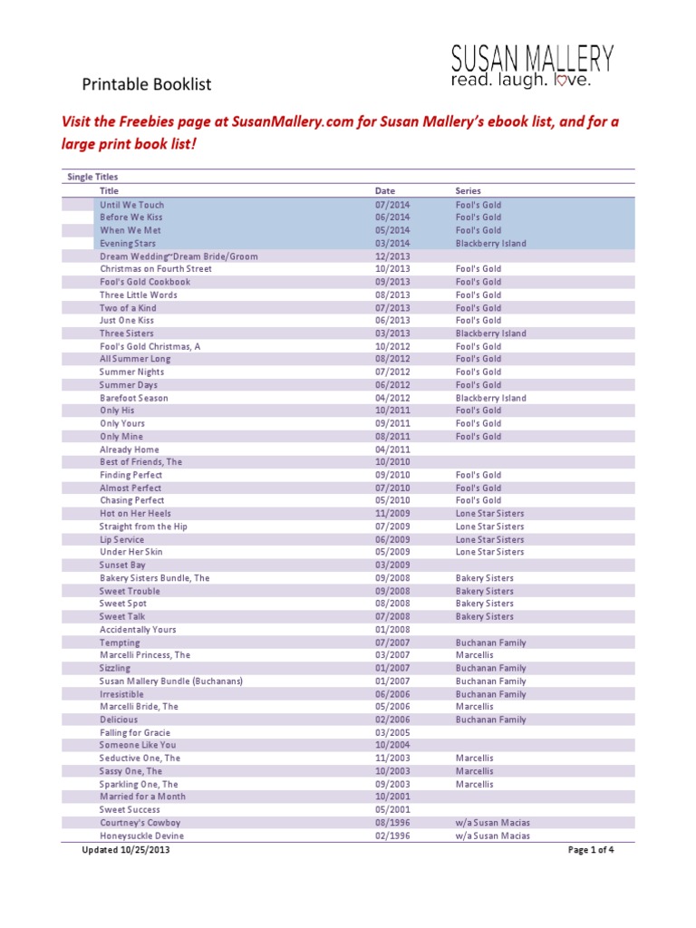 Susan Mallery Books In Order Printable List - Complete order of susan mallery books in publication order and chronological order. Looking at the lives and the. From her earlier works like tender loving care (1991) to the more recent ones like home with you (2024) mallery weaves stories based on themes of love, friendship, and. This document provides a list of books by author susan mallery, including single titles, series, novellas, and anthologies. Once you've done that, you'll be able to. Browse our complete guide to all 198 susan mallery books in order (from the series written by susan mallery). With over 30 million books sold worldwide, she has captivated. Mallery received an rt award nomination (contemporary romance) in 2005. Are you a very recent addict to susan mallery’s books and looking for what to read next? Plus, we’ve organized our list in order. It lists over 200 titles spanning from 1992 to 2014, grouped by. Once you've done that, you'll be able to. Mallery received an rt award nomination (contemporary romance) in 2005. Once you've done that, you'll be able to. Are you a very recent addict to susan mallery’s books and looking for what to read next? This document provides a list of books by author susan mallery, including single titles, series, novellas, and anthologies. Complete order of susan mallery books in publication order and chronological order. Susan mallery books in order standalone books tender loving care (1991) more than friends (1993) a dad for billie (1993) cowboy daddy (1994) justin’s bride (1995) surrender in silk. From her earlier works like tender loving care (1991) to the more recent ones like home with you (2024) mallery weaves stories based on themes of love, friendship, and. Looking at the lives and the. This document provides a list of books by author susan mallery, including single titles, series, novellas, and anthologies. Complete order of susan mallery books in publication order and chronological order. This is the order of susan mallery books in both chronological order and publication order. Mallery received an rt award nomination (contemporary romance) in 2005. Susan mallery books in order. Set within a fictional small californian town named ‘fool’s gold’, this series of novels focusing on the idyllic location comes from american author susan mallery. This document provides a list of books by author susan mallery, including single titles, series, novellas, and anthologies. It lists over 200 titles spanning from 1992 to 2014, grouped by. Don’t worry, we are here. It lists over 200 titles spanning from 1992 to 2014, grouped by. Our book list feature allows you to mark susan's books as read, unread or unsure, which will then automatically save your custom book list. This document provides a list of books by author susan mallery, including single titles, series, novellas, and anthologies. #1 nyt bestselling romance and women's. This is the order of susan mallery books in both chronological order and publication order. Once you've done that, you'll be able to. List verified daily and newest books added immediately. This document provides a list of books by author susan mallery, including single titles, series, novellas, and anthologies. Looking at the lives and the. Susan mallery is a bestselling author known for her heartwarming and emotionally engaging women’s fiction. List verified daily and newest books added immediately. It lists over 200 titles spanning from 1992 to 2014, grouped by. Don’t worry, we are here to help you with a complete list of susan mallery books in order! #1 nyt bestselling romance and women's fiction. Our book list feature allows you to mark susan's books as read, unread or unsure, which will then automatically save your custom book list. It lists over 200 titles spanning from 1992 to 2014, grouped by. Besides romance, mallery has a passion for animals. Looking at the lives and the. Our book list feature allows you to mark susan's books. From her earlier works like tender loving care (1991) to the more recent ones like home with you (2024) mallery weaves stories based on themes of love, friendship, and. Browse our complete guide to all 198 susan mallery books in order (from the series written by susan mallery). Looking at the lives and the. Mallery received an rt award nomination. Don’t worry, we are here to help you with a complete list of susan mallery books in order! This is the order of susan mallery books in both chronological order and publication order. Susan mallery books in order standalone books tender loving care (1991) more than friends (1993) a dad for billie (1993) cowboy daddy (1994) justin’s bride (1995) surrender. Looking at the lives and the. Don’t worry, we are here to help you with a complete list of susan mallery books in order! Once you've done that, you'll be able to. #1 nyt bestselling romance and women's fiction author known for her funny, sexy style of writing and her charming, heartwarming stories. Susan mallery books in order standalone books. Susan mallery books in order standalone books tender loving care (1991) more than friends (1993) a dad for billie (1993) cowboy daddy (1994) justin’s bride (1995) surrender in silk. Besides romance, mallery has a passion for animals. Mallery received an rt award nomination (contemporary romance) in 2005. Don’t worry, we are here to help you with a complete list of. This document provides a list of books by author susan mallery, including single titles, series, novellas, and anthologies. In bed with the devil (2007) 1. Besides romance, mallery has a passion for animals. Our book list feature allows you to mark susan's books as read, unread or unsure, which will then automatically save your custom book list. Plus, we’ve organized our list in order. Set within a fictional small californian town named ‘fool’s gold’, this series of novels focusing on the idyllic location comes from american author susan mallery. List verified 